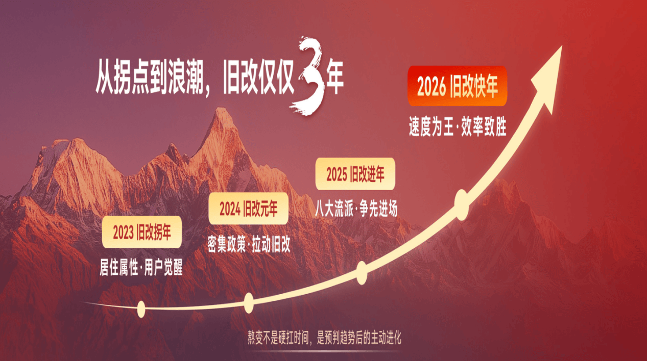 演讲中清晰勾勒了旧改市场近几年演进脉络:最终定义2026年将进入“旧改快年”,以“速度与效率”为核心竞争力的阶段。程总分享“熬”不是被动等待,而是基于趋势预判的主动进化,鲤享家将通过“好房子战略下的全场景居家服务商”定位,携手生态伙伴共同开启存量时代的新篇章。