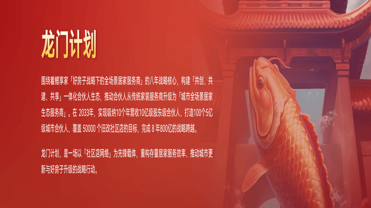 跨年演讲中,程总首次系统阐释了面向2033年的长期战略蓝图——“鲤享龙门计划”。该计划核心是围绕“好房子战略下的全场景居家服务商” 定位,构建 “共创、共建、共享”的一体化合伙人生态,推动合伙人从传统家装服务商升级为“城市全场景居家生态服务商”。